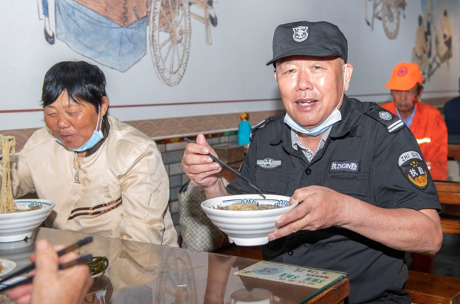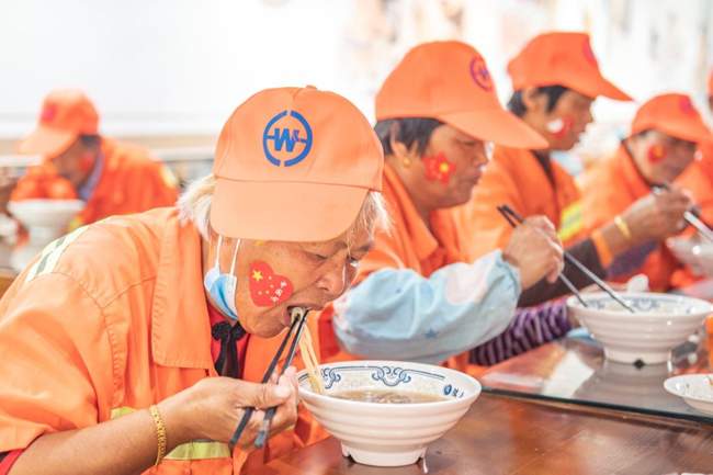 一碗“國慶面”,一份愛國情。當(dāng)一碗碗熱氣騰騰、香氣撲鼻的面條送到環(huán)衛(wèi)工人、快遞小哥等堅(jiān)守在一線崗位上的工作人員手中,大家接過面條,享用著寓意美好的“國慶面”,每個(gè)人的臉上都洋溢著幸福和快樂的笑容。大家用最樸素最平常的食物,表達(dá)了對祖國母親生日快樂的真摯情感。