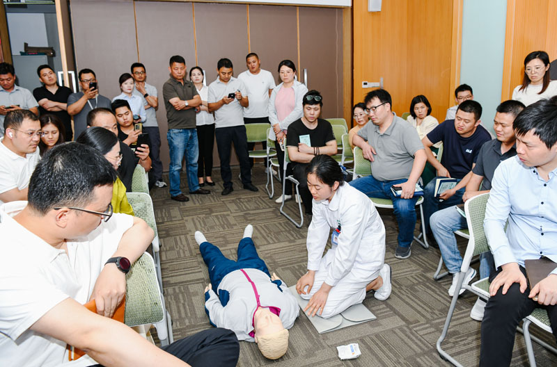 在第一階段活動現(xiàn)場,醫(yī)護(hù)人員通過PPT的形式,為大家詳細(xì)講解了心肺復(fù)蘇、AED使用、海姆立克急救法的操作要點(diǎn)和注意事項(xiàng),以及夏季高溫中暑的自救互救應(yīng)急處理知識,并通過互動方式一對一指導(dǎo)教學(xué),鍛煉了實(shí)際操作能力。隨后,醫(yī)護(hù)人員也為在場職工進(jìn)行血壓、血糖等項(xiàng)目測量,中醫(yī)把脈問診、家庭醫(yī)生簽約等便民服務(wù),參加此次活動的職工紛紛表示受益匪淺。